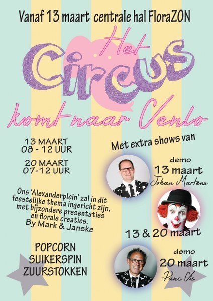 Het circus komt naar Venlo! In een feestelijke hal presenteren we volop ideeën voor opvallende presentaties en etalages. Hoe kunt u de aandacht van uw (potentiële) klanten trekken? Wij geven enkele leuke ideeën die realiseerbaar zijn met ieder budget. Op 13 & 20 maart zijn Flower Toppers Johan Martens en Panc Vis aanwezig, zij gaan aan de slag met commerciële arrangementen voor Pasen. Ook aan toepasselijk entertainment en versnaperingen is gedacht! « Terug naar nieuwsoverzicht